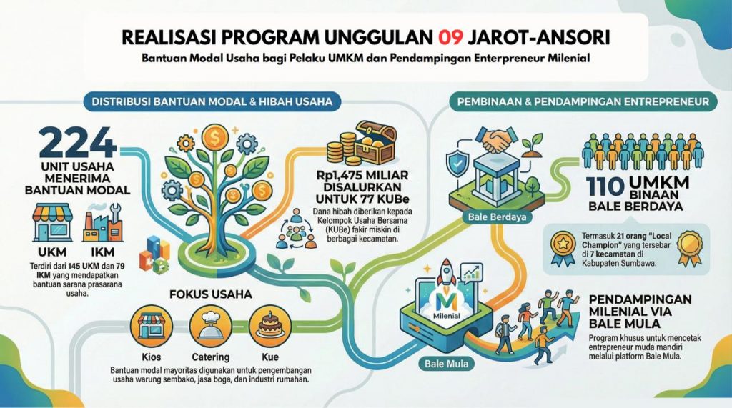 Bantuan tersebut mayoritas dimanfaatkan untuk pengembangan usaha kios, catering, dan industri kue rumahan. Selain itu, sebanyak 110 UMKM dibina melalui program Bale Berdaya, termasuk 21 pelaku usaha yang ditetapkan sebagai “Local Champion” di tujuh kecamatan. Pendampingan generasi milenial juga dilakukan melalui platform Bale Mula untuk mendorong lahirnya wirausaha muda mandiri.