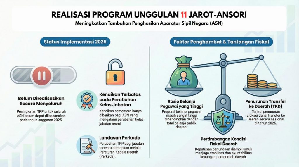 Sementara itu, pada Program Unggulan 11 terkait peningkatan Tambahan Penghasilan Pegawai (TPP) ASN, pemerintah daerah mengakui implementasi belum dapat dilakukan secara menyeluruh pada 2025. Kenaikan TPP baru diberikan secara terbatas bagi ASN yang mengalami perubahan kelas jabatan resmi melalui Peraturan Kepala Daerah (Perkada). Kebijakan ini dipengaruhi tingginya rasio belanja pegawai serta penurunan Transfer ke Daerah (TKD) secara nasional, sehingga pemerintah memilih langkah penyesuaian demi menjaga stabilitas fiskal daerah.