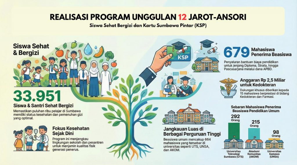 Dalam sektor pendidikan dan kesehatan, Program Siswa Sehat Bergizi dan Kartu Sumbawa Pintar (KSP) menjadi salah satu prioritas utama. Tercatat sebanyak 33.951 siswa dan santri telah mendapatkan manfaat program pemenuhan gizi dan layanan kesehatan. Program ini menyasar sekolah dan pesantren guna memastikan generasi muda Sumbawa tumbuh dengan kondisi fisik yang sehat dan optimal.