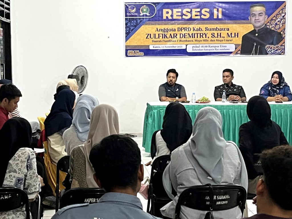 Sumbawa, TamaNews.id – Wakil Ketua III DPRD Kabupaten Sumbawa, Zulfikar Demitry, SH., MH., menyambangi Fakultas Kesehatan Universitas Samawa (UNSA) dalam kegiatan Reses pada Kamis, 13 November 2025.